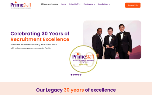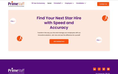- Brand Presence Craft a professional and credible online presence that reflects PrimeStaff’s 30‑year legacy in recruitment and HR solutions. Reinforce brand trust by showcasing services, awards, and milestones clearly and confidently.